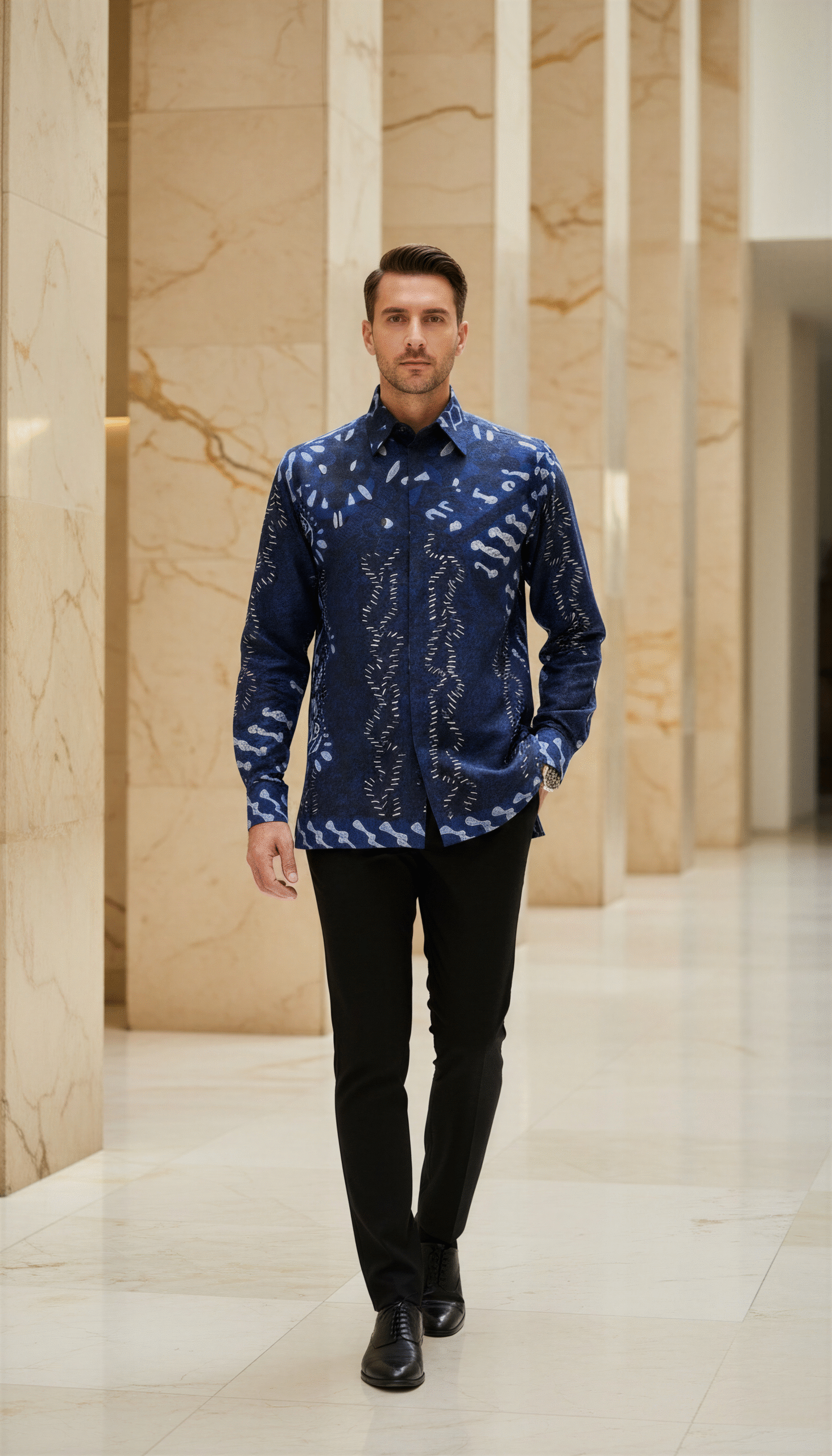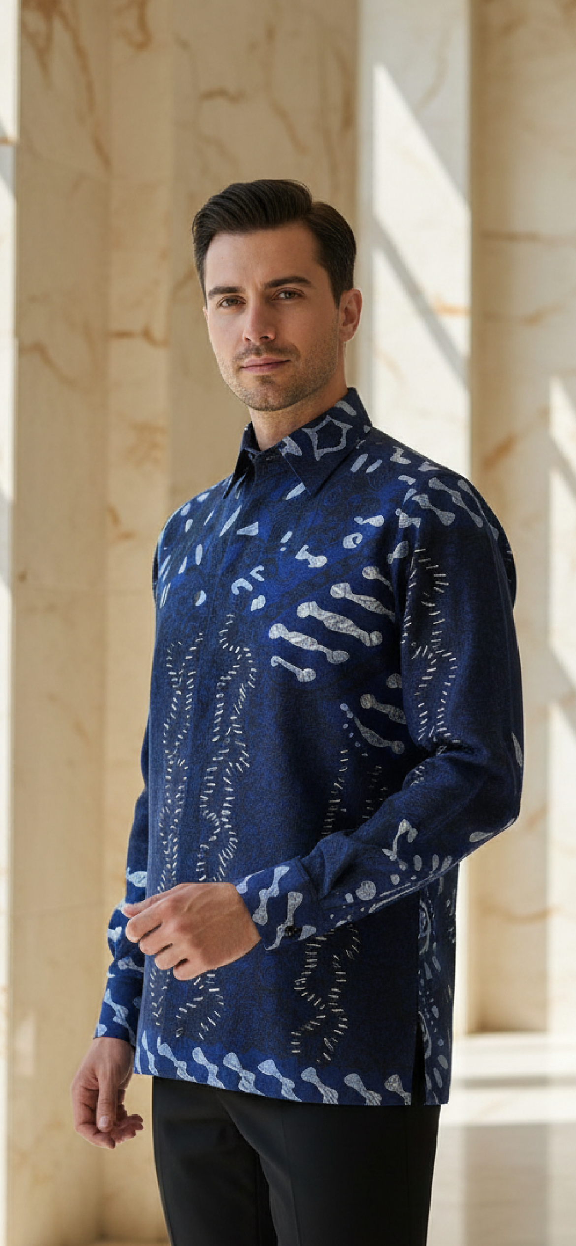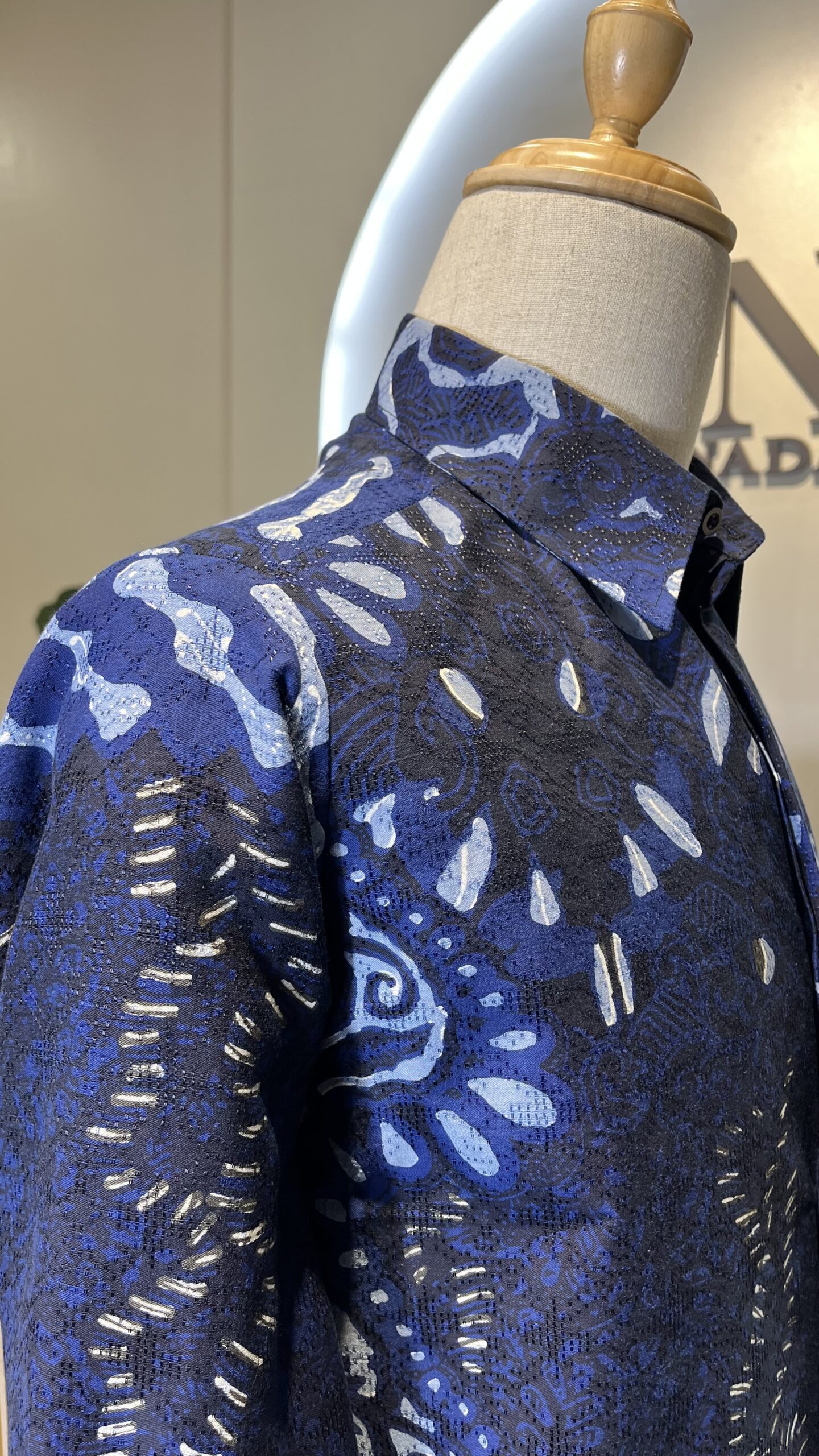Authentic handcrafted batik on premium cotton dobby — an exclusive piece made to elevate your style. Designed in deep blue with modern handcrafted motifs.