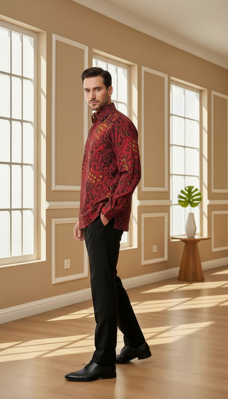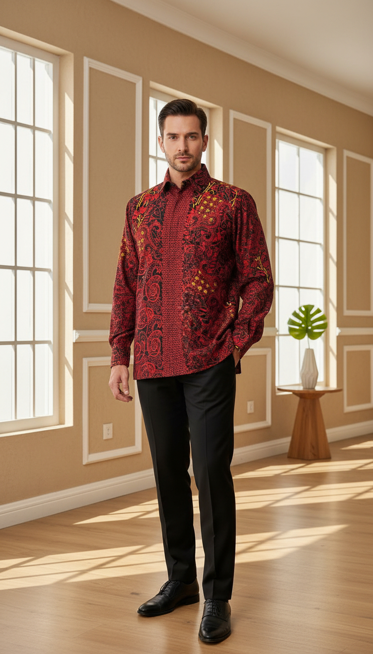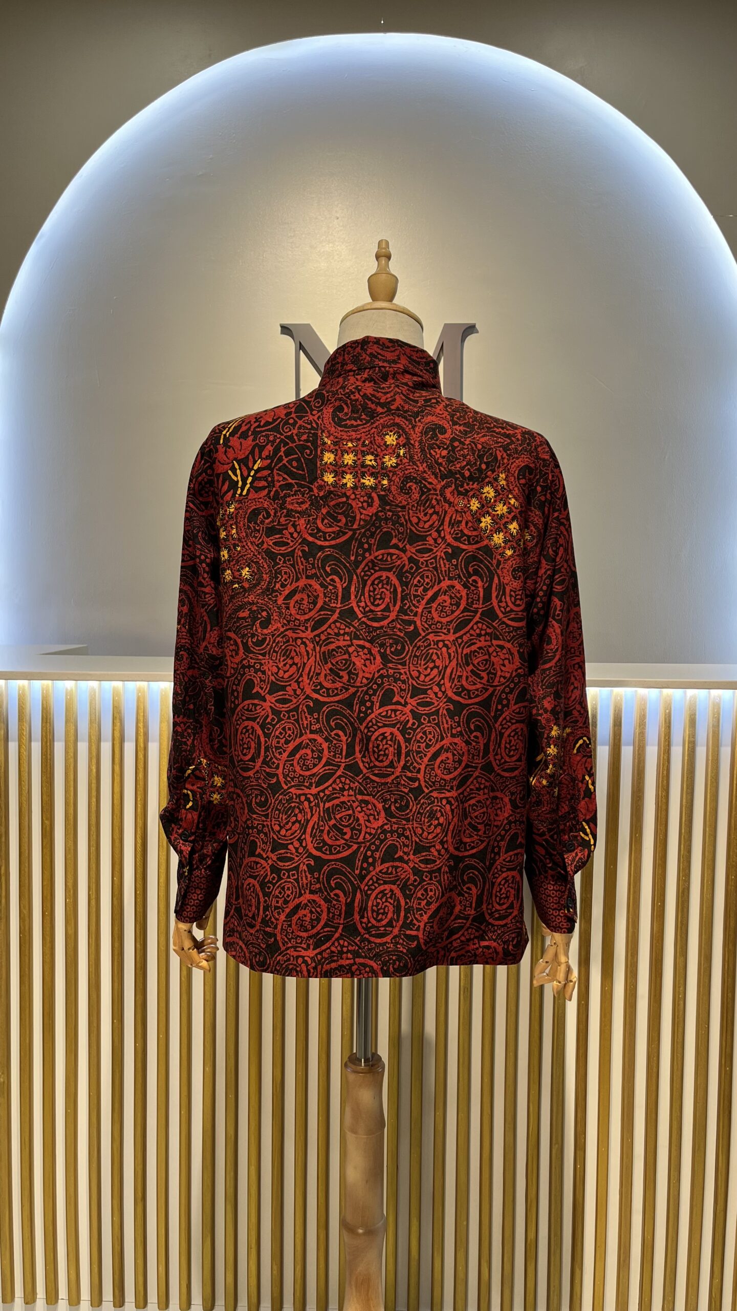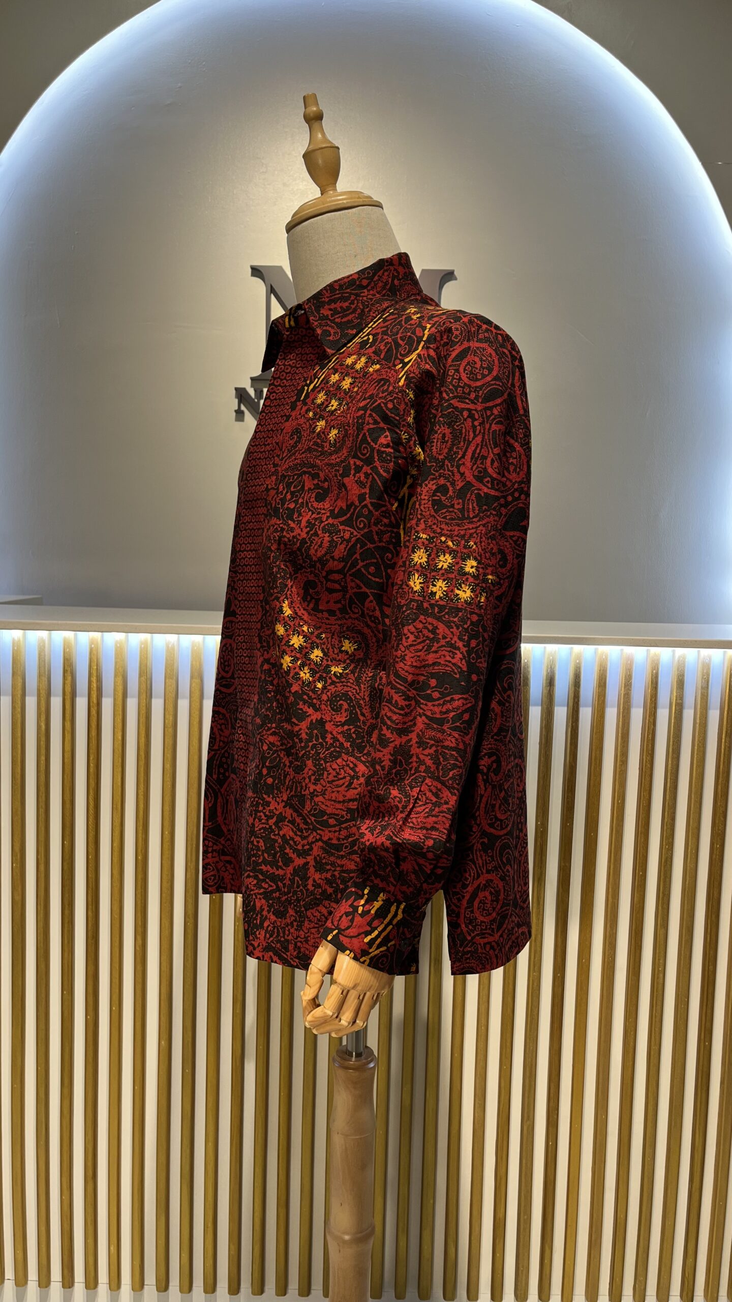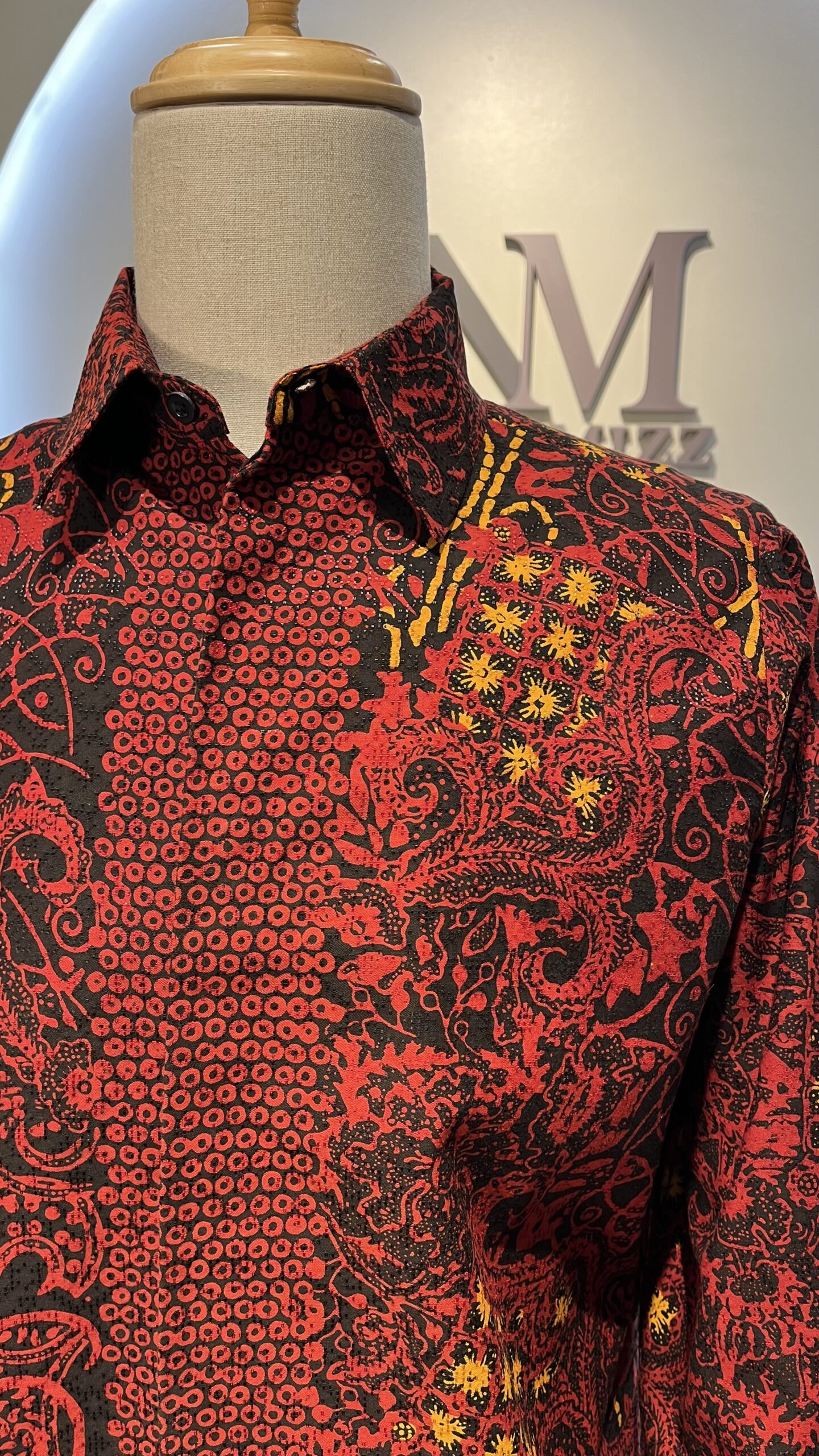 This pola batik shirt stands out with its bold red and black palette, elevated by touches of golden yellow that add richness and depth. Every motif is meticulously crafted, from the florals to the structured dot patterns, creating a stunning balance of tradition and modern artistry.