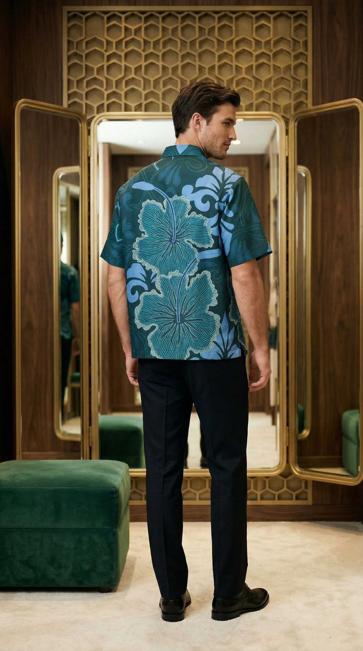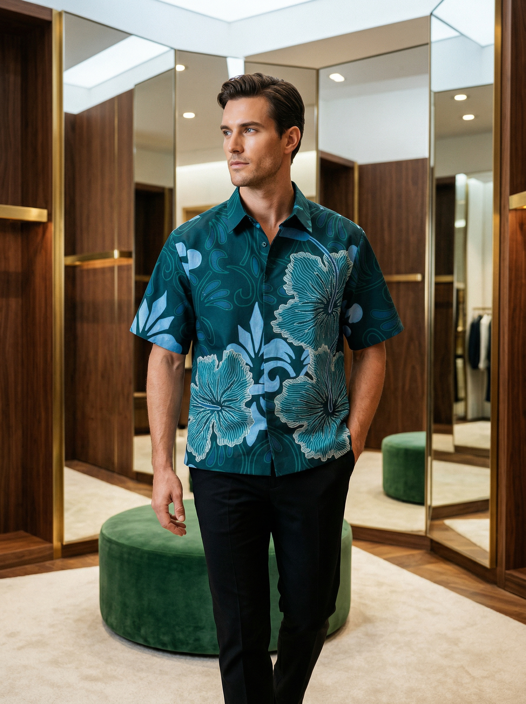 This hand-painted batik shirt features bold teal floral motifs on a rich emerald base, blending traditional artistry with a modern, sophisticated style.
