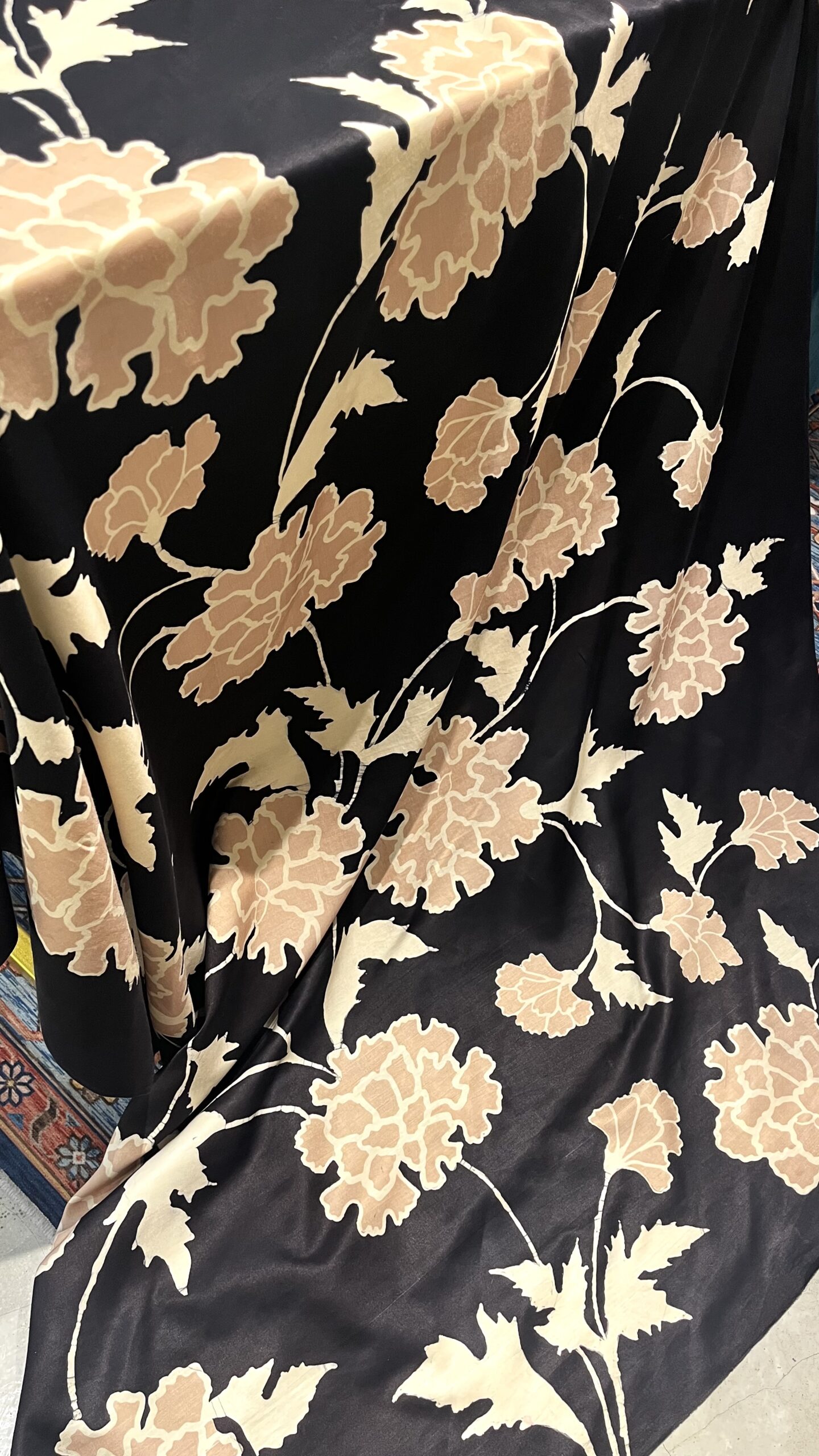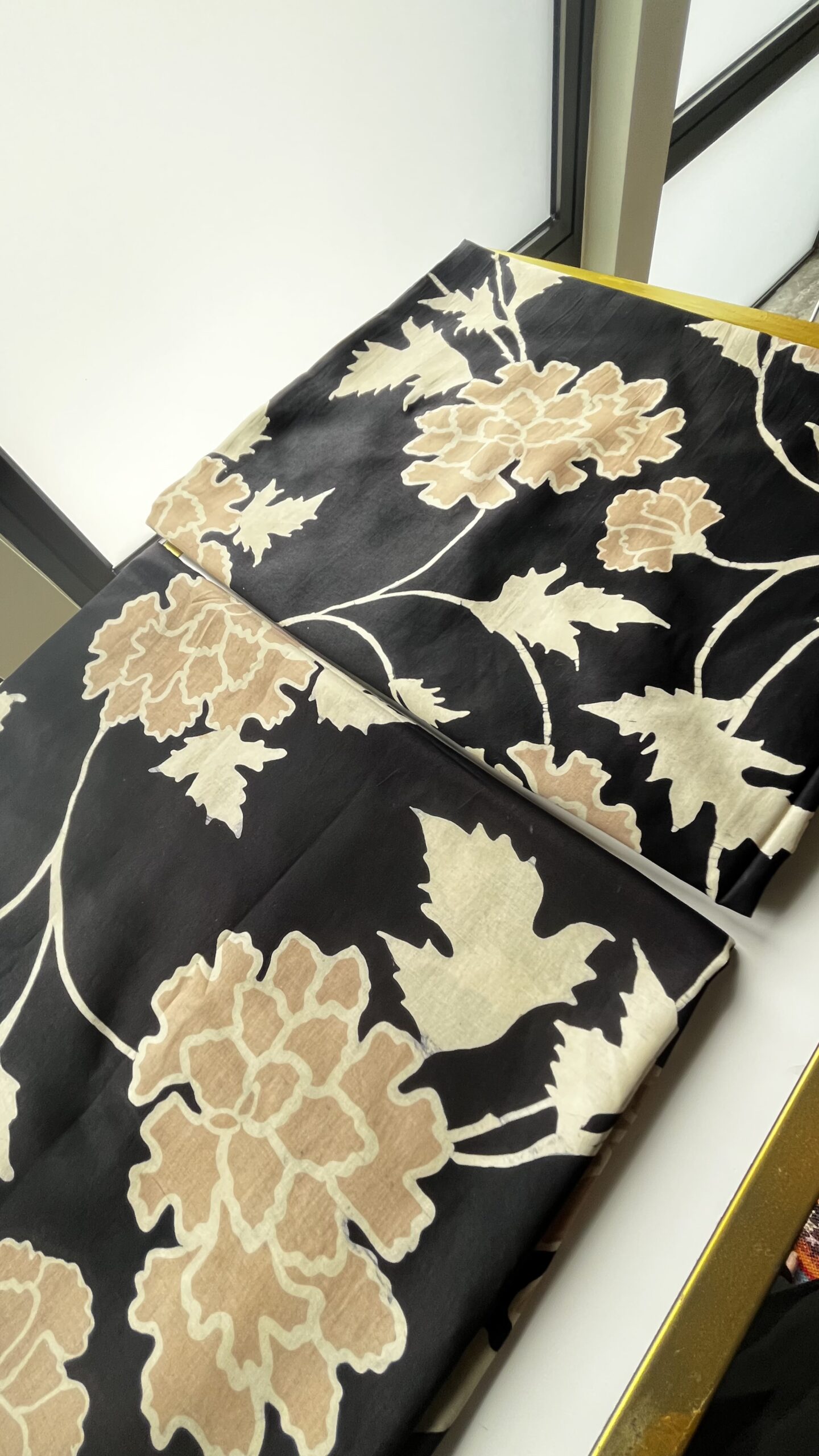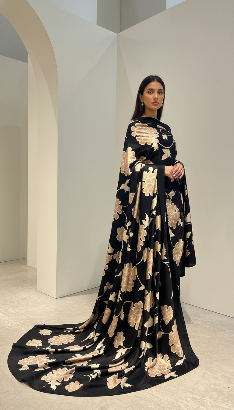 A sophisticated black base comes alive with soft beige florals, hand-painted in graceful batik artistry. Lightweight with a beautiful drape, this luxurious piece flows effortlessly — a timeless expression of elegance in motion.